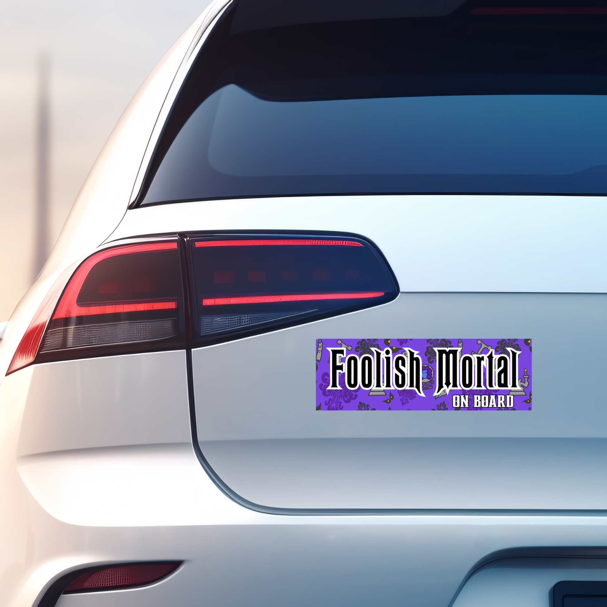 Spooky and stylish, this Foolish Mortal On Board bumper sticker brings Haunted Mansion vibes to your car. Ideal for Halloween fans and every day is Halloween fans.